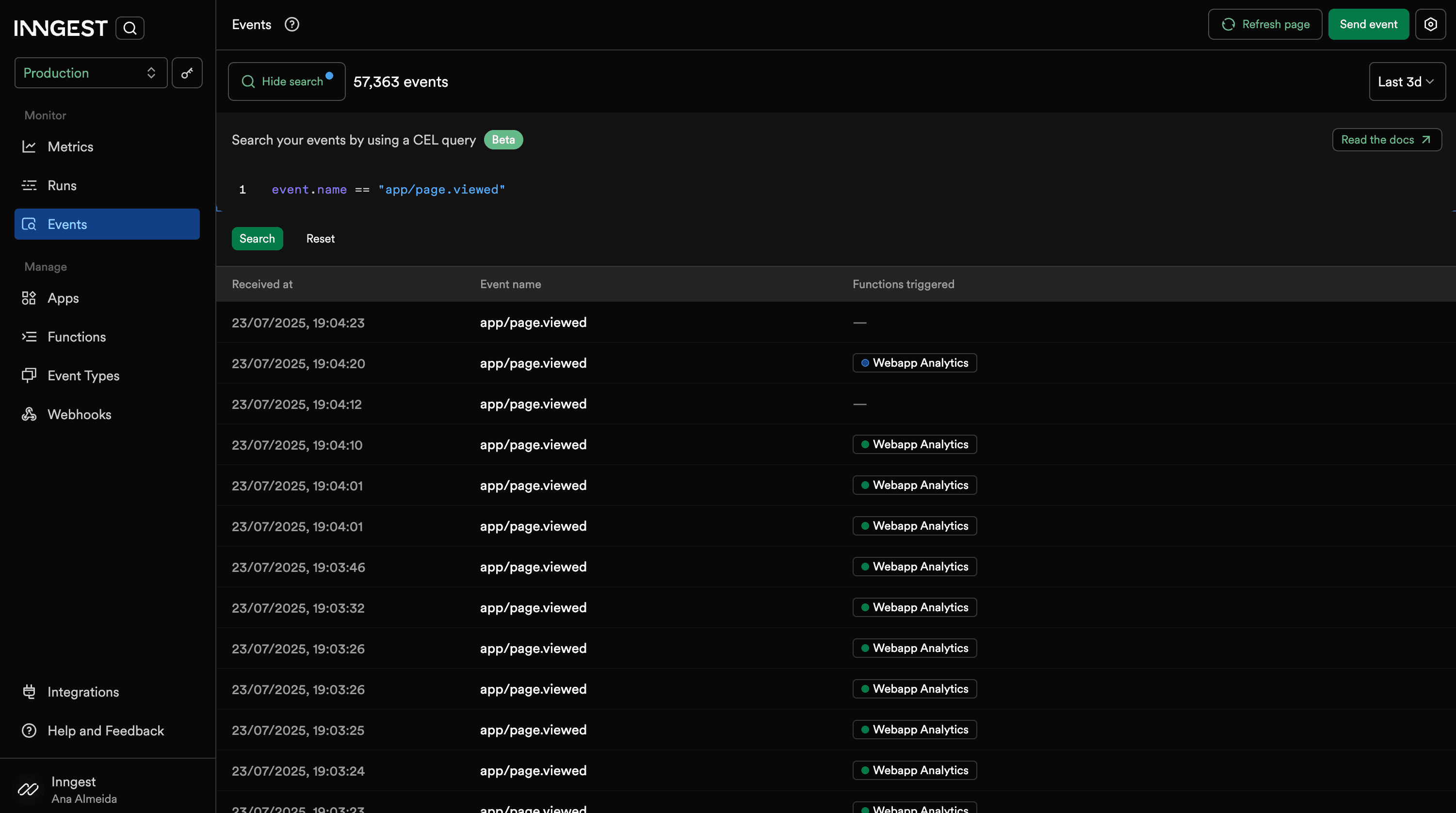 We've added a new event history explorer to the Inngest dashboard. This view allows you to view all events across an entire environment. A filtered view is also available when viewing a specific event type.
