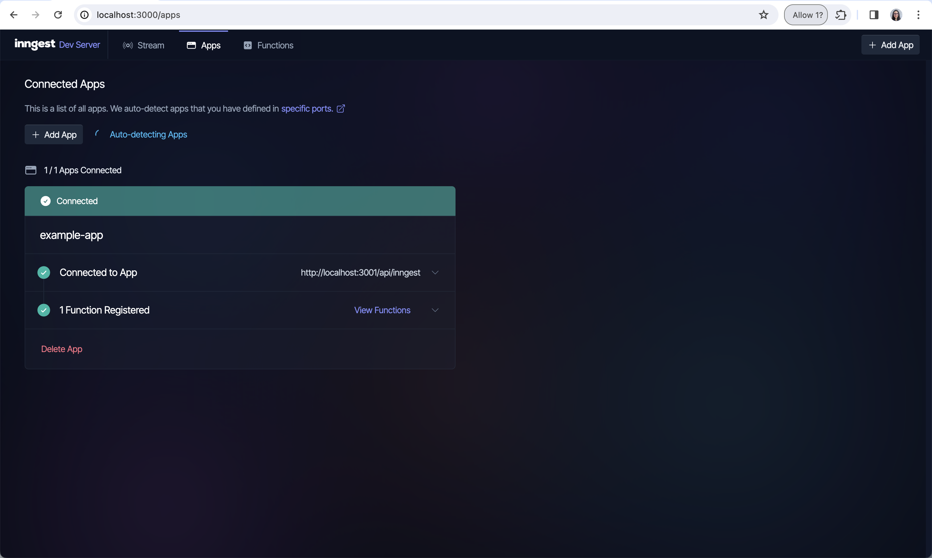 In the image below, you can see the apps page in Inngest Dev Server. For more information on how to sync apps in Inngest Dev Server check the Local Development Guide.