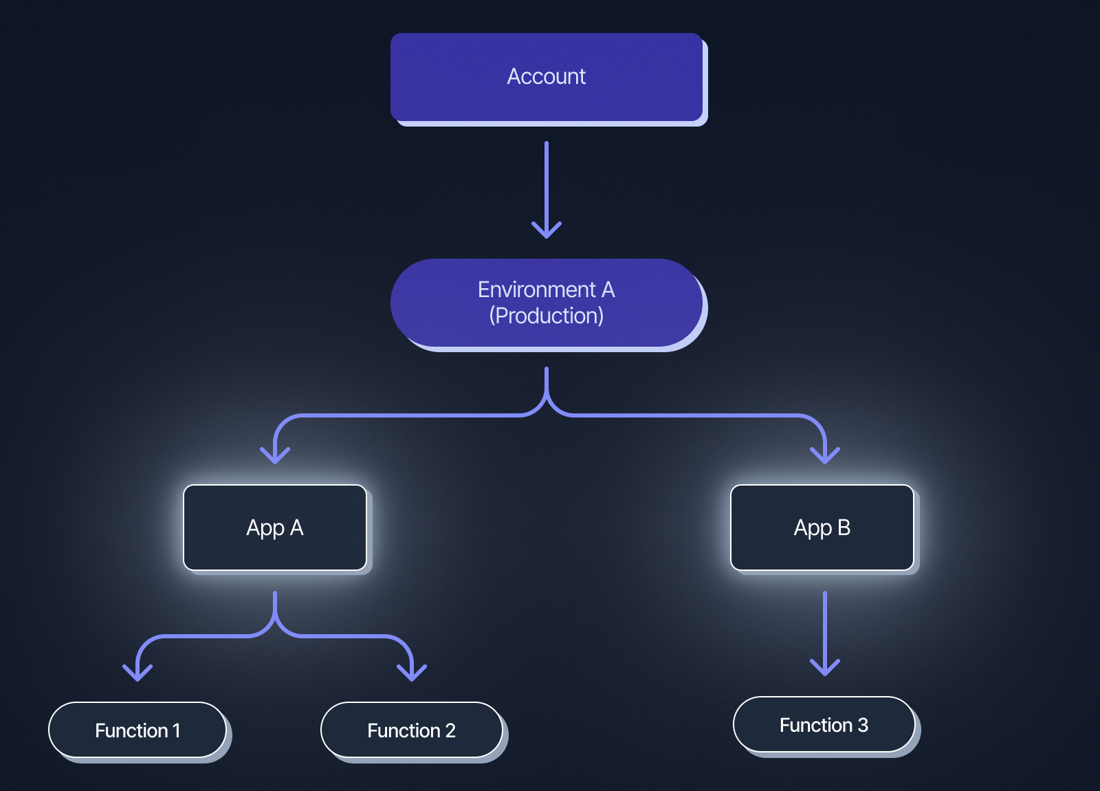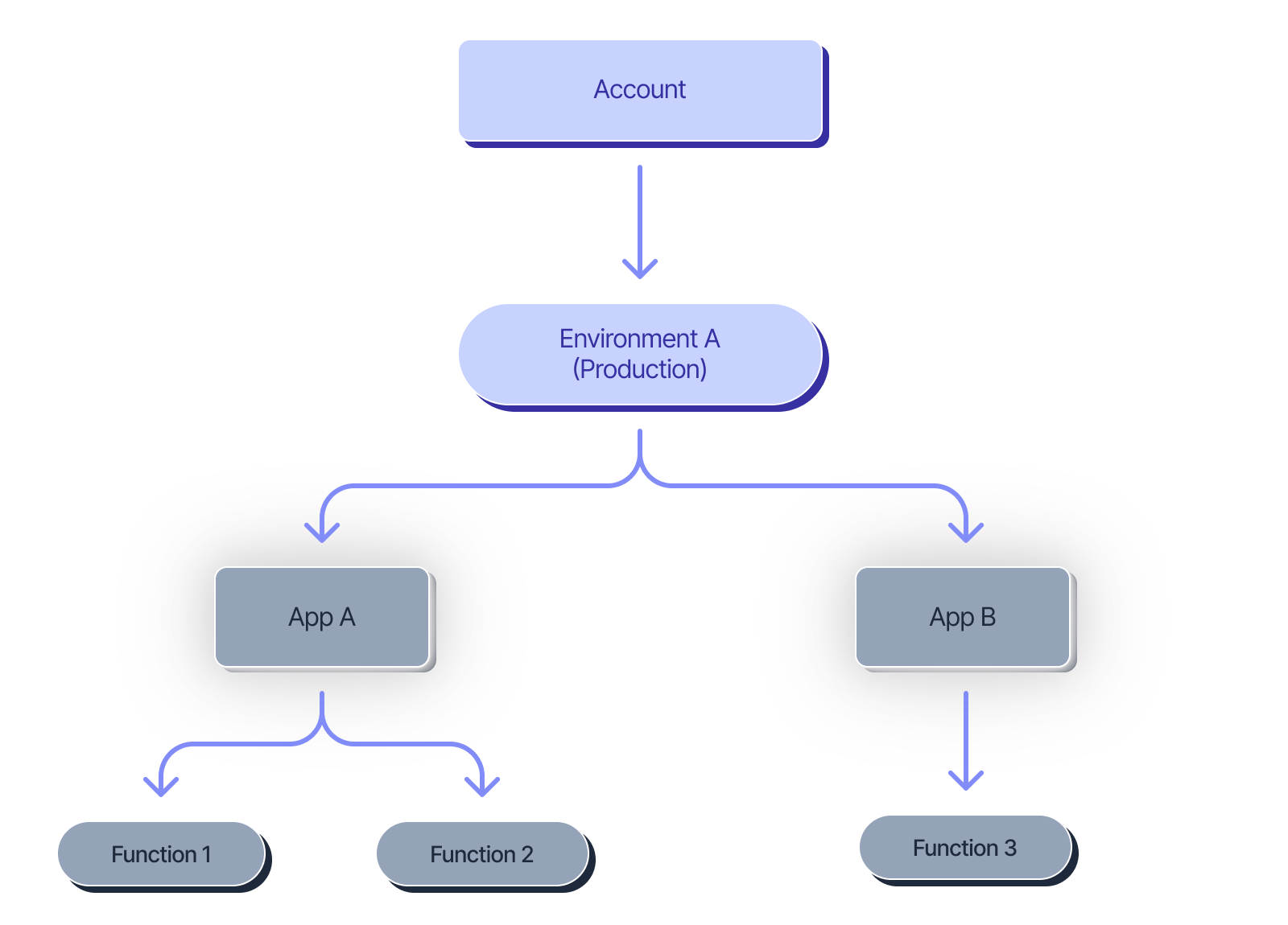The diagram below shows how each environment can have multiple apps which can have multiple functions each: